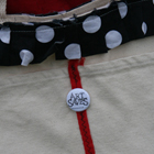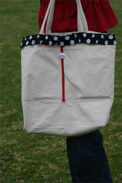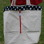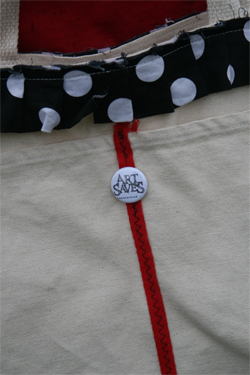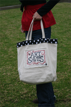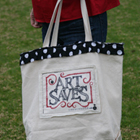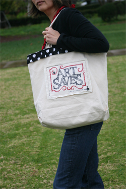 This roomy tote comes with an ART SAVES panel layered with batting and stitched to the front. On the reverse side is a splash of red ribbon stitched in between two deep pockets. A black with white polka dot ruffle adorns the edge.