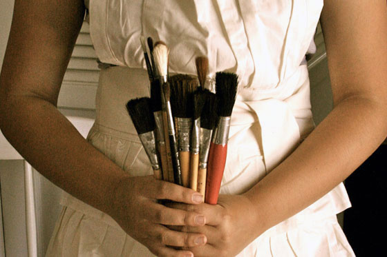 | This ultra feminine apron is made of cream muslin and can dress up blue jeans, a dress, or a skirt. It is 24 inches wide, and each tie measures 30 1/2 inches. The measurement from the bodice to hem is 35 1/2 inches. Wear it to your next art event, or to your next picnic with the family. And if you dare, wear it while you paint your next masterpiece.