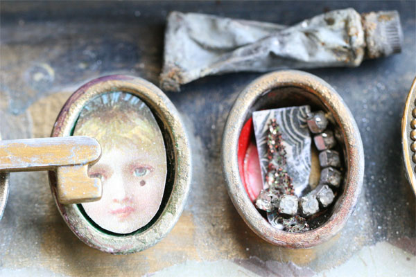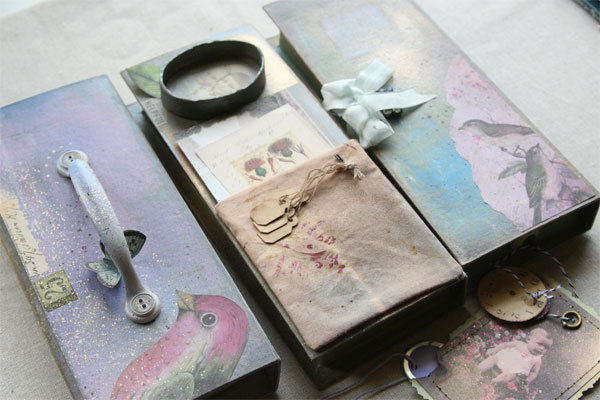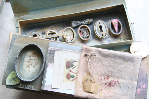 Multi-media artist Connie Govea Stuart has long been inspired by the intrigue and beauty of vintage paintboxes. This inspiration has caused Connie to create artwork with special techniques that capture the magic of these paintboxes. Her distinctive techniques include painting, paper clay sculpting, stitching, dyeing, collaging, rubber stamping, and more.