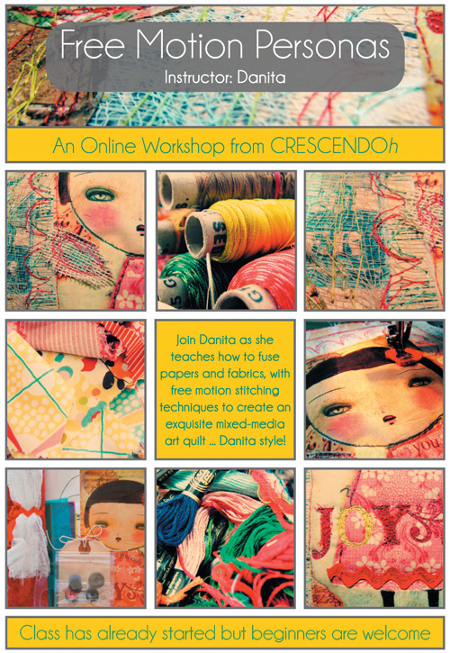 This is a 4-week online course. Once you enroll, you will receive a FREE Danita's Free Motion Personas Kit that includes: Danita image of angel printed on fabric, Felt, Batting, Muslin, Buttons, Crocheted flowers, Art tissue (white and colored), Cheesecloth, and Ephemera. Once you are all settled into this site, you'll be able to create your profile, participate in forum discussions, chats, and more. The great thing about CRESCENDOh Creative Lab is that once you sign up, you are part of a community ... where you can interact as much or as little with the other members of the community - at your pace, and in the comfort of your own home. You will also have exclusive access to all of the videos and class-specific materials including: