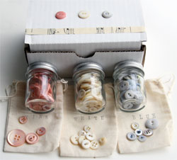 NOTE: All buttons are packaged in small jars with silver-toned lids, encased in hand-stamped muslin pouches. These jars-in-pouches are then packaged within a white box that is adorned with buttons, sheet music, and stamping.